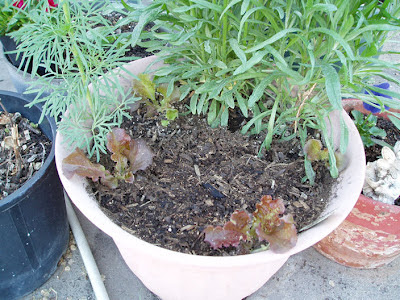 And right next to these pots of pansy and dianthus is a large pot of nothing but 'volunteer' plants. I have red lettuce, a wild larkspur (It originally came from a seed packet of double-flower larkspur, but I keep getting the offspring seedlings that reverted to the natural, original form with smaller single flowers every spring... for 17 years now.), and a third generation cornflower/bachelor's buttons. The volunteer plants always do extremely well. They seem to know just when to come up only in the most favorable micro-climate area around the house.